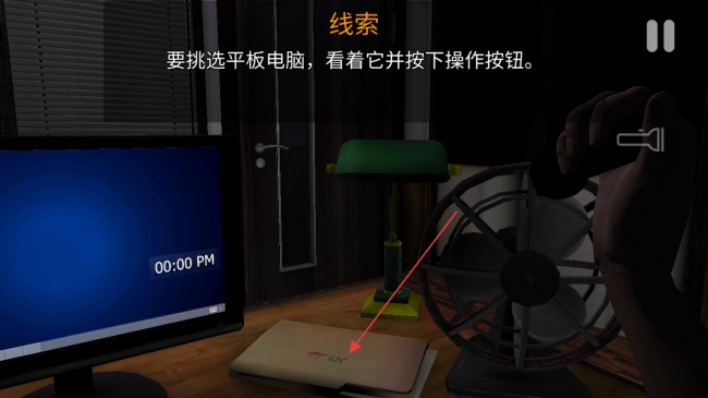 3、成功拿到手电筒后,可利用其照明,同时留意场景中的其他物品,此时提到有平板电脑,为后续操作做铺垫。