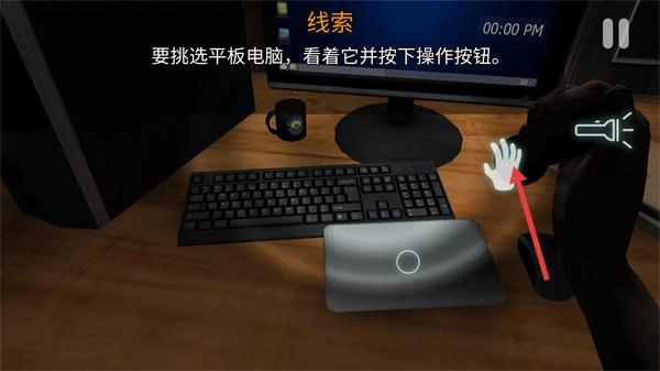4、接着根据新的线索,要挑选平板电脑,找到桌上的平板电脑,看着它并按下操作按钮,获取平板电脑,推进游戏进程。