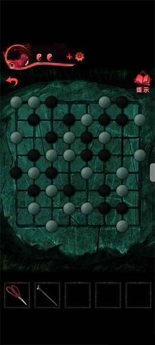 女孩子在下面拿拐杖把佛头移到机关上,再去外面把树杈上的皮影剪下来,男的捡走然后进庙,看完牌子妹子下棋,吃就完事了最后剩将帅,拿走半个喜字。