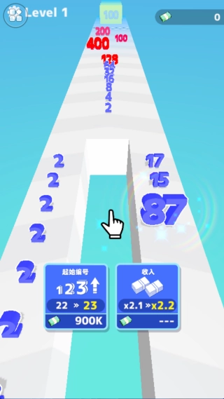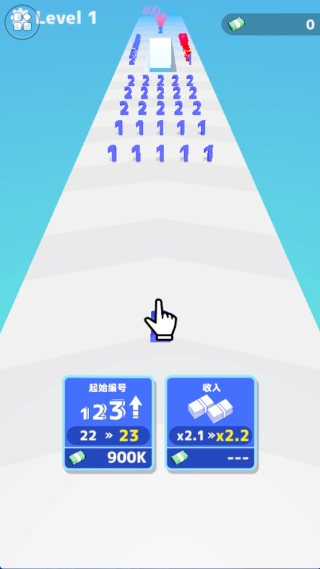 2、进入关卡后,左右滑动屏幕控制数字在跑道上移动,撞击比你小的数字进行升级进化。
