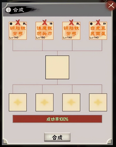 有一种合成方式是所有合成里操作最简便的:只需在指定的第一行位置放入四件非坐骑类的装备,点击合成按钮后,系统会从这四件装备里随机选出一件作为最终产出。需要注意的是,装备品质越高,被选中的概率就越低,但产出装备的品质不会超出原装备本身的品质范围——比如像方天这类特定装备,最终合成结果必然是橙色品质。另外,新生成的装备孔数也没有固定值,可能是四孔,也可能是五孔。