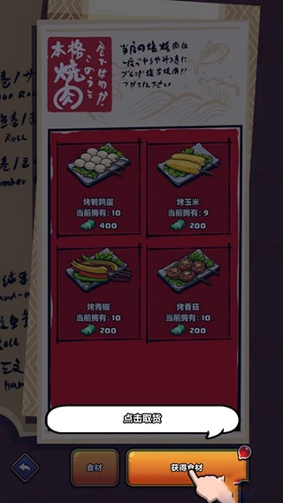 在“烧烤摊”这个建筑物里,点击下方的“获得食材”按钮。
