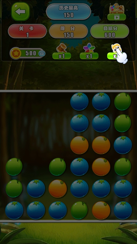 点击上方的道具“锤子”,选择想要消除的水果,就能帮你消除更多水果哦。