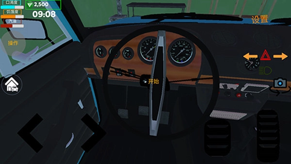 坐进车里后,把操作准星移到方向盘后方的钥匙孔位置,持续按住左上角的启动键(务必保持长按状态,直到仪表盘出现动态反馈),待车辆完成启动流程,就可以用右下角的刹车和油门装置来操控车辆行进了。