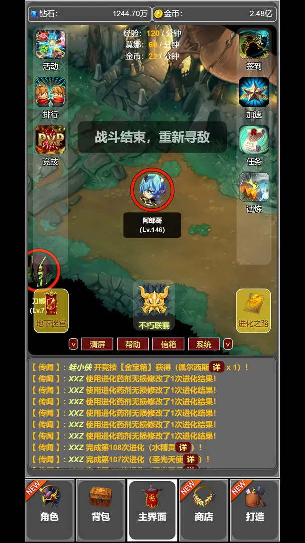 若游戏内还有进化机会,可选择抽取卡片,或是前往新解锁的地下迷宫获取装备与卡片。在地下迷宫里,每击败一层的BOSS,玩家就能在线挂机清理该层的小怪。不过要留意,挂机时每场战斗都会消耗1点体力,所以不建议在低层待太长时间。