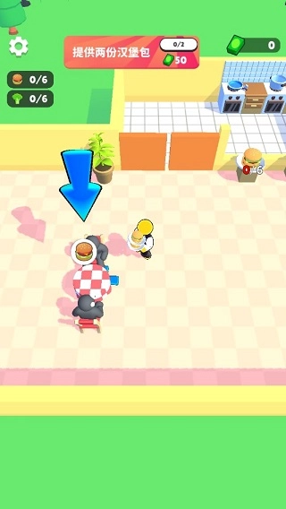 餐食制作完毕后,从操作区移步至用餐区,前往指定地点领取汉堡,再借助虚拟摇杆操控角色,把汉堡递送到顾客面前就完成了。