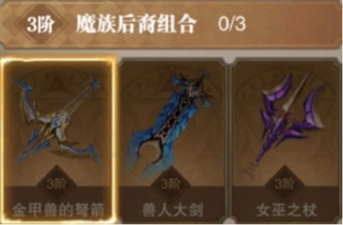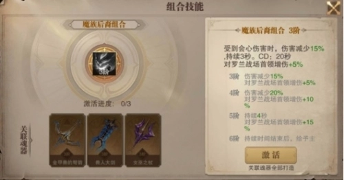橙色技能“魔兽后裔”激活时即为3阶,激活条件是集齐【金甲兽的弩箭】、【兽人大剑】、【女巫之杖】这三种魂器。因为该技能属于金色品质,所以每种魂器都需要消耗30张对应的碎片才能激活。当成功激活魔兽后裔的组合技能后,角色在受到会心伤害时,所受伤害会降低15%,此效果持续3秒,同时对罗兰战场的首领造成的伤害提升5%。该技能的最高等级为6阶,每提升1阶,伤害减少的比例和对首领的增伤比例都会相应增加;当技能达到满阶(6阶)时,在伤害减少的持续时间结束后,还会对主目标造成1次技能系数为180%的会心伤害,并且对罗兰战场首领的增伤效果将提升至20%。