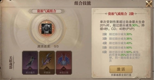 红色技能“贵族气质”的激活门槛为2阶,激活时需集齐三种魂器:【武士魂刃】(消耗30个碎片解锁)、【手里剑】(消耗60个碎片解锁)、【冰后之冠】(消耗90个碎片解锁)。当成功激活“贵族气质”组合技能后,在PVP战斗场景中,若单次受到的伤害数值超过自身最大生命值的20%,那么超出该阈值的伤害部分将获得30%的减免效果,此减免状态持续4秒。随着技能阶级提升,减免比例逐步增加:2阶减免30%,3阶提升至35%,4阶达40%,5阶则最高可减免50%!