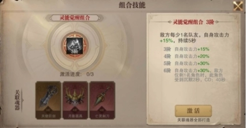 灵能觉醒的激活条件为3阶,需集齐三种魂器:【天使巨剑】(消耗60个碎片解锁)、【月影面具】(消耗90个碎片解锁)、【亡灵刺刀】(消耗90个碎片解锁)。其技能效果是:敌方存活队友数量每减少1名,自身攻击力提升15%,该效果持续5秒。简单来说,在PVP对战中,对手每阵亡一个角色,自身就能获得15%的攻击力加成。此外,不同阶级对应不同的攻击力增幅:3阶时攻击力增加15%,4阶提升至20%,5阶则高达30%!