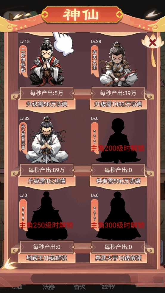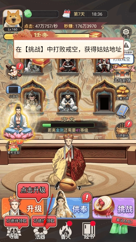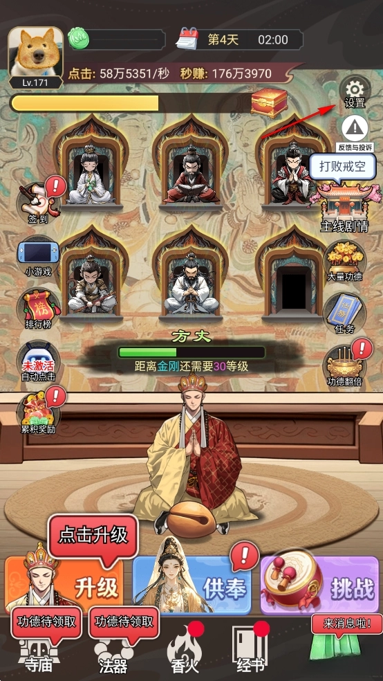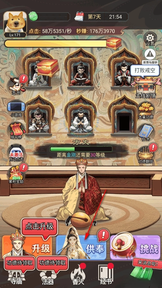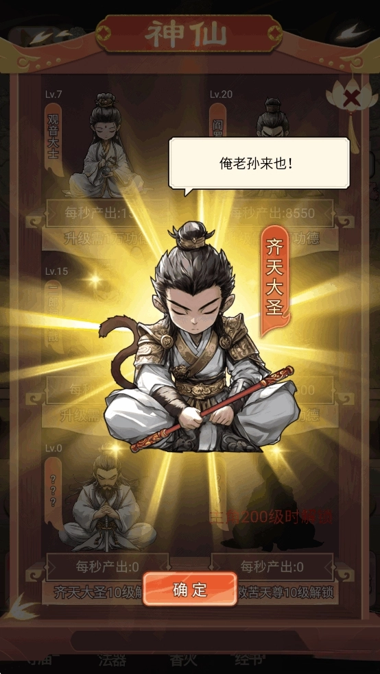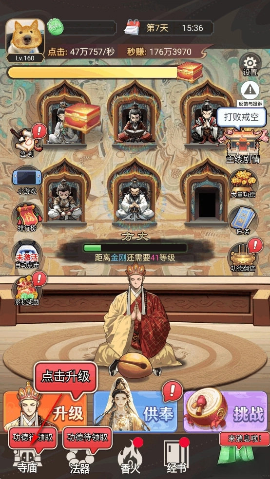 这是一款融合点击放置玩法与剧情闯关模式的游戏。玩家在推进主线剧情的过程中,需持续敲击木鱼来积累功德值,这些功德值能够助力玩家角色逐步成长,实现从小沙弥到佛祖的进阶蜕变。