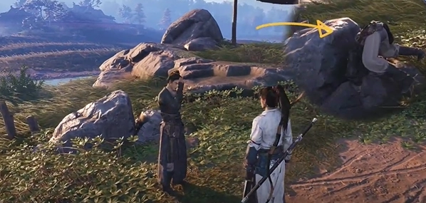 新手前期按照任务指引走完天涯客那段路后,会发现有个人卡在石头缝里。