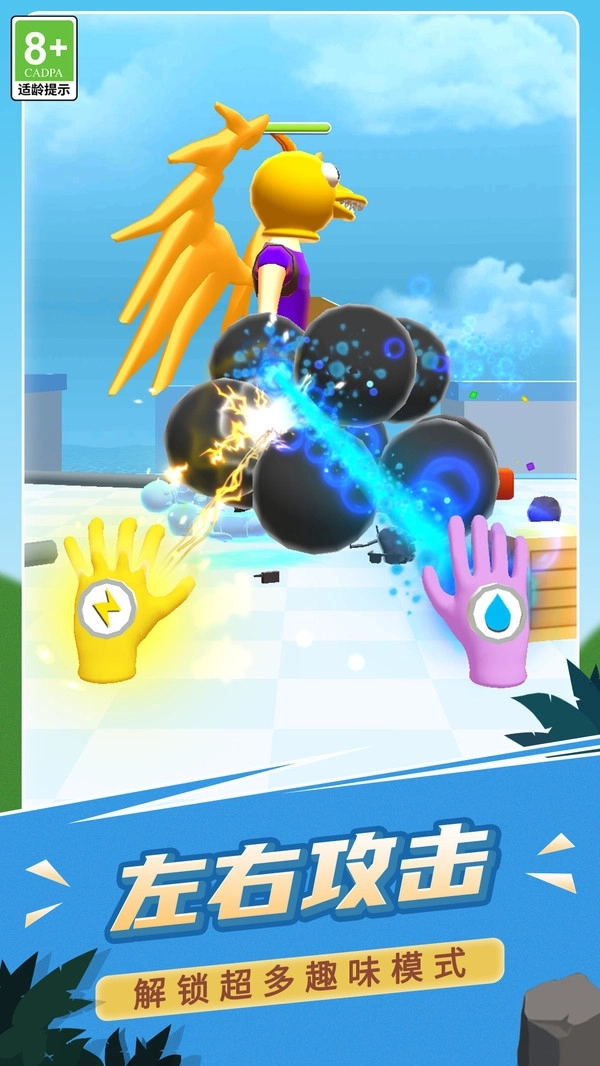 小心被轰飞!《小心炸飞你》是一款超带感的解压格斗游戏!你将化身为正义的勇士,戴上拥有酷炫技能的手套,利用闪电、水流等强力技能,狠狠教训那些匪徒。游戏里有各种各样的装扮和技能等着你来解锁,在关卡中精准释放招式,击败凶恶的敌人,就能获得最终的胜利。无论是想休闲解压,还是挑战高难度关卡,这款游戏都能让你玩得超爽,赶紧来开启这场热血沸腾的战斗之旅吧!