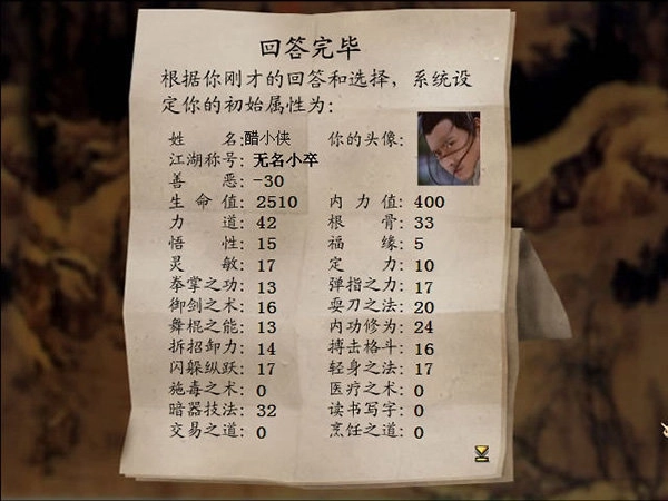 7、十年磨一剑:开局领悟左右互搏之术,各项武器熟练度均为75,轻身属性为10,其余属性初始值为1;属性将根据答题表现进行增减调整,且角色不可进行重铸或重生操作。