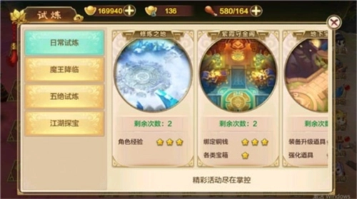 在日常试炼玩法里,玩家能挑战多种试炼副本,每个副本都有其专属奖励——比如修炼之地可供给玩家海量经验;秘宝矿洞能让玩家获取大量宝石素材与生产材料;守卫摩云顶则会产出丰富的武功和气功道具。不同试炼的开启时间各有差异,参与试炼需消耗一定体力,鉴于体力有限,建议优先挑选自己最急需的试炼参与~