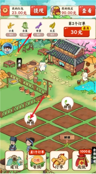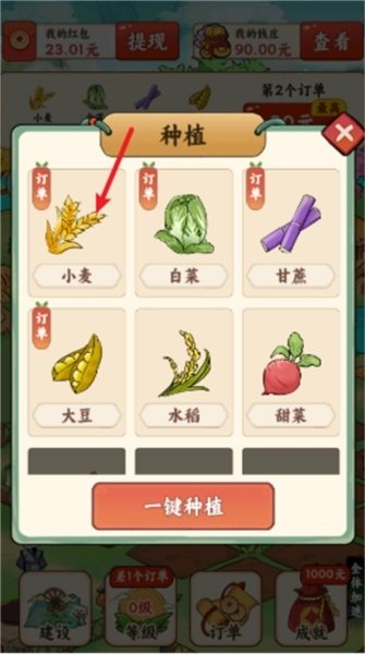 1、这里有经典又有趣的田园种植玩法,只需简单点击就能种下各类作物,完成订单后就能领取红包啦。