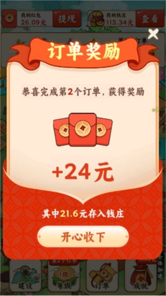 游戏订单奖励规则:玩家在游戏里完成订单就能得到红包奖励,完成的订单数量越多,所获得的红包福利就越丰厚。