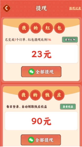 3、订单任务的顺利完成,还能帮你解锁更高的红包兑换率,订单累积得越多,兑换比例就会跟着提升,让你的收益像作物生长一样越来越好!