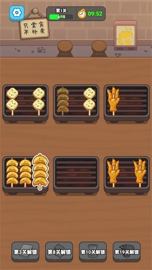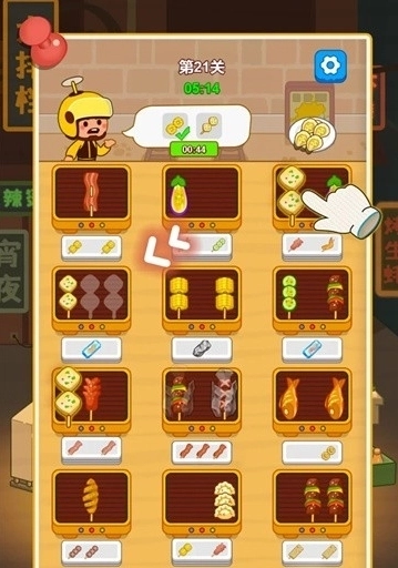 2、玩家只需把三个一样的串串放在同一个烤肉盘里,就能完成消除操作。