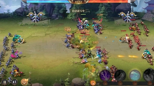 2、竞技场战斗采用自动模式,点击左下角的暂停键可呼出菜单,进行特效、音效相关设置;调整战斗速度的按键也位于左下角。上方的红、蓝色血条能直观呈现双方当前的实力对比,便于玩家更清晰地洞悉场上形势。