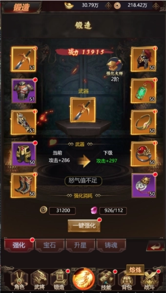 普通强化:消耗铜钱与金属精华对装备进行常规强化,存在失败概率。通过强化装备,能够提升装备的属性数值。