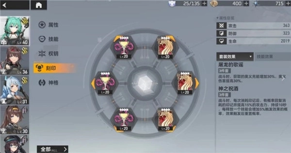 雏心的刻印搭配推荐屠龙的歌谣3件套与神之祝酒3件套:屠龙的歌谣能提升战斗中奥义充能的获取速度,同时增加奥义伤害;神之祝酒则是在战斗里每消耗一次印记,就有概率回复印记并提高攻击力,且每次释放技能后,回复印记的概率还会进一步提升。这套刻印组合可增强雏心大招的伤害,显著提升她的整体能力。