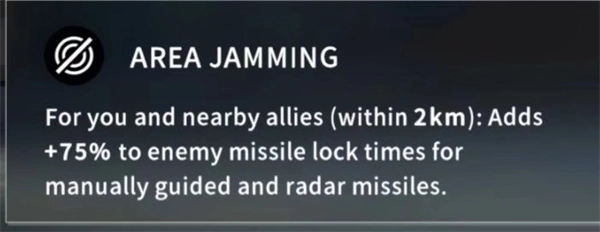 在自身2公里范围内的队友都能获得该特性,当受到雷达类导弹锁定攻击时,会延长其75%的锁定时间