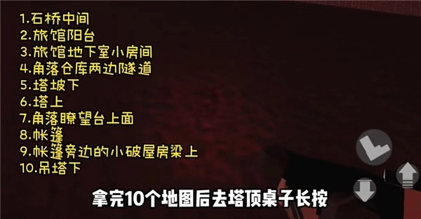 4、10个蓝图的具体位置如下:石桥中央、旅馆的阳台、旅馆地下室的小房间、角落仓库两侧的隧道、塔坡下方、塔的顶部、角落瞭望台的上面、帐篷、帐篷旁小破屋的房梁上以及吊塔的下方。