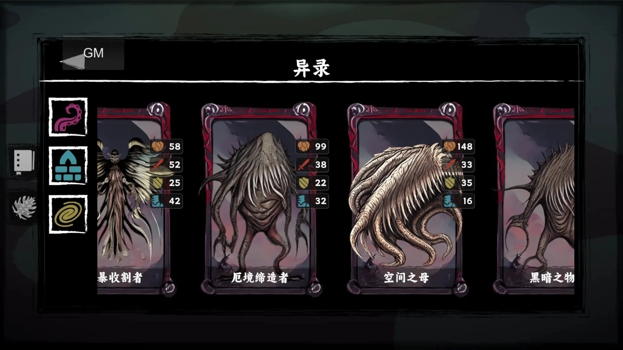《混沌将至》是一款由个人独立开发的克苏鲁神话题材卡牌类roguelike游戏。游戏采用暗黑简约的美术风格,设计了众多形态诡异的怪物,结合肉鸽卡牌的策略冒险玩法,玩家将踏入混沌之域展开探索——在这片领域中,你会遭遇各类神秘且令人疯狂的生物与事件,需要收集强力遗物来驱逐怪物,务必在心智被侵蚀前逃离此地。