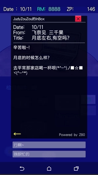 5、界面右上角的“Message”其实就是邮件功能。大家要记得及时回复邮件哦,回复时在邮件内容下方会出现可选择的选项,第一次点击是选定该选项,第二次点击才是正式发送。发送完成后先别急着起身,回到电脑主界面后说不定马上就能收到回复。每个月中旬会收到来自三千果的邮件,这封邮件一定要回复,否则可能会错过现实世界相关的剧情内容。