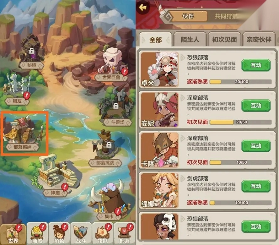 每个部落通常设有5名NPC:首领负责技能学习,大祭司掌管职位晋升(与技能学习相关联),战士长管理部落集市,其余两位战士则是可结交的伙伴。需要注意的是,加入部落之后即可向他们赠送礼物以提升好感度,即便后续退出部落,好感度状态也会保留,只是需要通过“世界-部落羁绊”入口找到他们再进行互动操作。