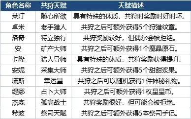 接下来要讲的是和伙伴们一起共狩这个关键环节啦。与伙伴共狩不仅能获取狩猎经验,还可能得到一些特殊道具,比如狩猎纹章、魔晶原石、甜甜浆果,甚至还有星星币哦。小编已经把前五个部落伙伴们的共狩天赋整理好啦,还没和他们建立羁绊的小伙伴们可要抓紧行动起来啦!