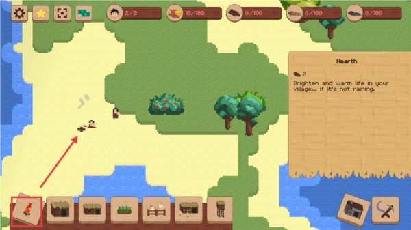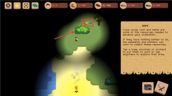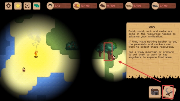3、夜晚时分,篝火能照亮一片区域,方便村民开展劳作。你可以点击右下角的工具图标,安排村民去砍伐树木、采集木材资源,以此推动文明的发展。
