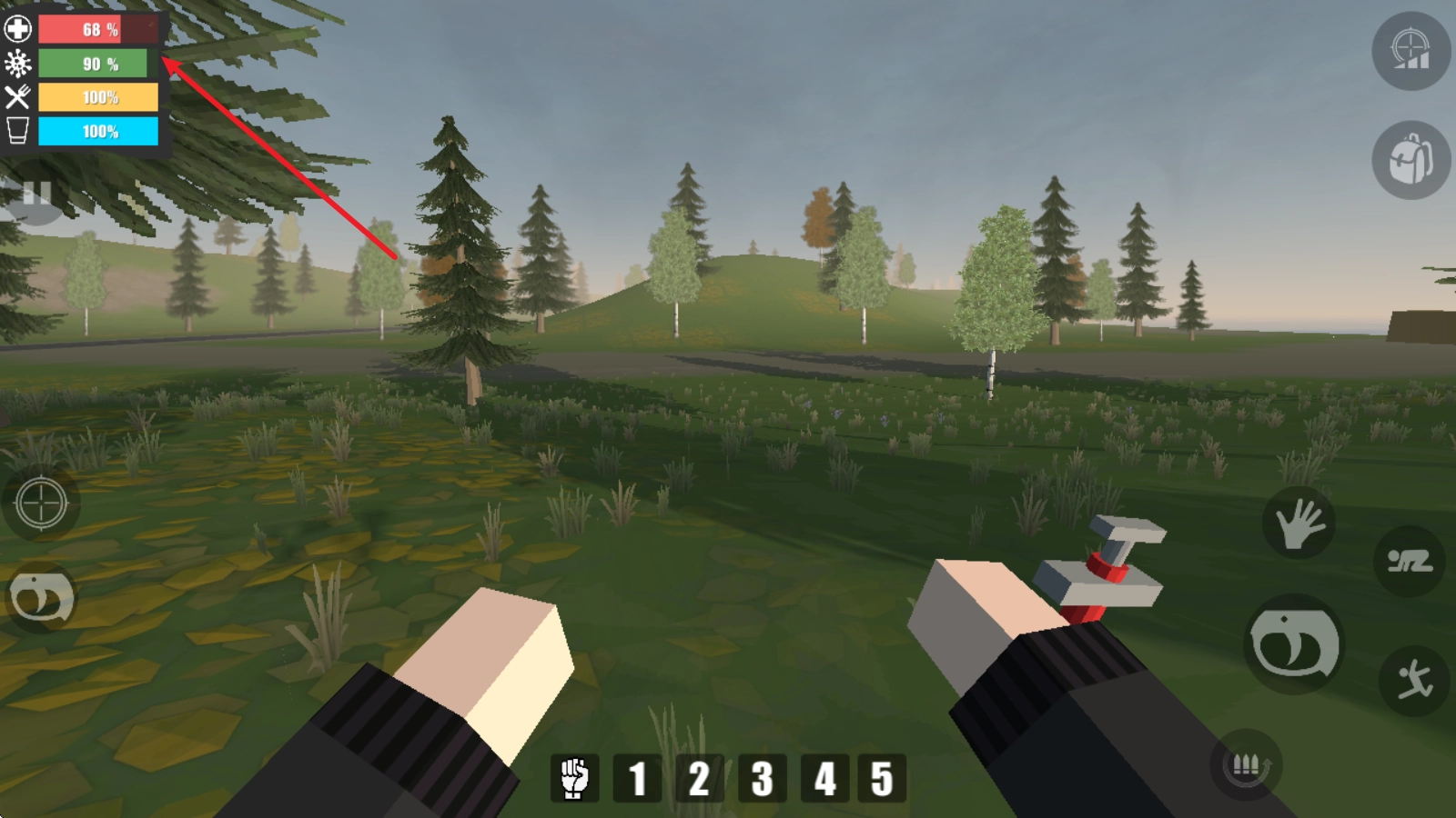 在画面的左上角,你可以清楚地看到自己的各项状态数据,比如当前的血量、饥饿值以及口渴度等信息。