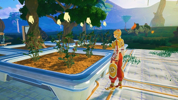 获得植物种子后,就能把它种在各种「种植盆」里。刚种下的植物是幼苗状态,得用心照料才能长大,这时候用「水枪」给它浇水,就能促使植物开始生长。