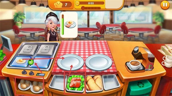 2、在餐台上制作【鸡蛋-面包】餐品,将其交付给对应顾客。