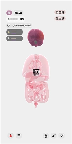 8、屏幕右上角所呈现的是该人体模型的异常状态,就像此刻,她正处于低血钾与低血糖的状况里。