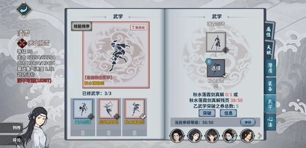 凌雪若未选择绝流派,外功可主修秋水落霞剑,辅修柴刀、霹雳棍法或后羿射日皆可;其中柴刀侧重臂力(即攻击力),霹雳棍法与后羿射日则侧重命中属性。需要说明的是,秋水落霞剑是完成中原小村商人发布的“山贼守则”任务后的奖励。
