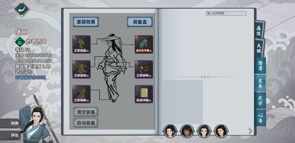 2、唐婉建议选择王家套,搭配自带饰品,武学可选道济拳或济世拳。资源充裕的玩家可以考虑合成道济套,但该套装消耗资源较多,不建议在PVE阶段就合成。