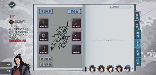 1、在控制流派的陆游配置中,PVE场景推荐搭配鬼谷套、自带饰品,武器选择巫玄刀或鬼谷武器较为合适