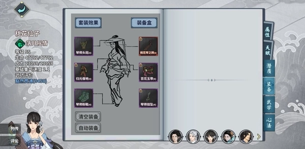 4、桃花仙子建议选择琴师头、琴师鞋、琴师饰品、归元袍、百花腰以及桃花琴之阴,等这些装备满级且学会通玄神功后,就可以逐步合成清寒套了。