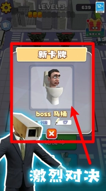2.击败敌方后可解锁新卡牌,获取boss马桶角色卡以强化当前队伍的战斗阵容。