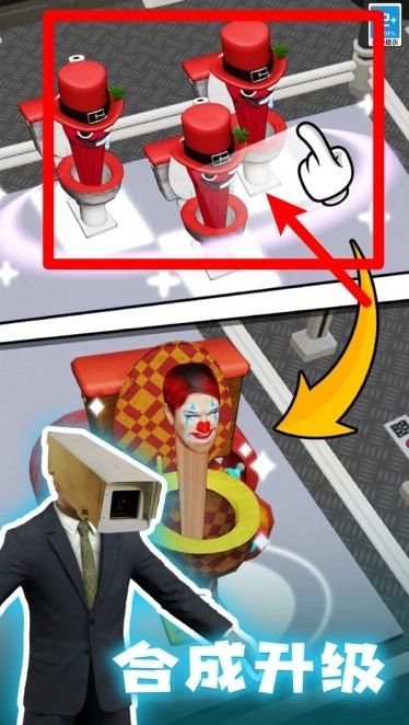 3.把相同角色拖曳合并,就能让普通马桶人升级成更高级的奇特外观和更强的战斗力。