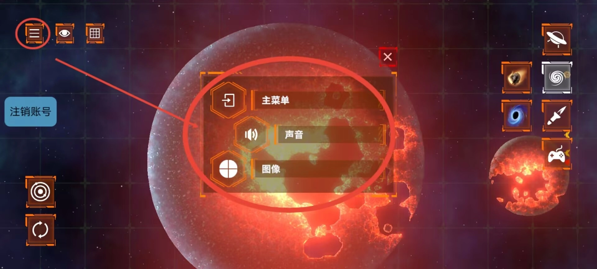 3、点击菜单按钮进入暂停界面后,能够进行返回主界面、调节音效以及画面参数等系统设置相关操作。