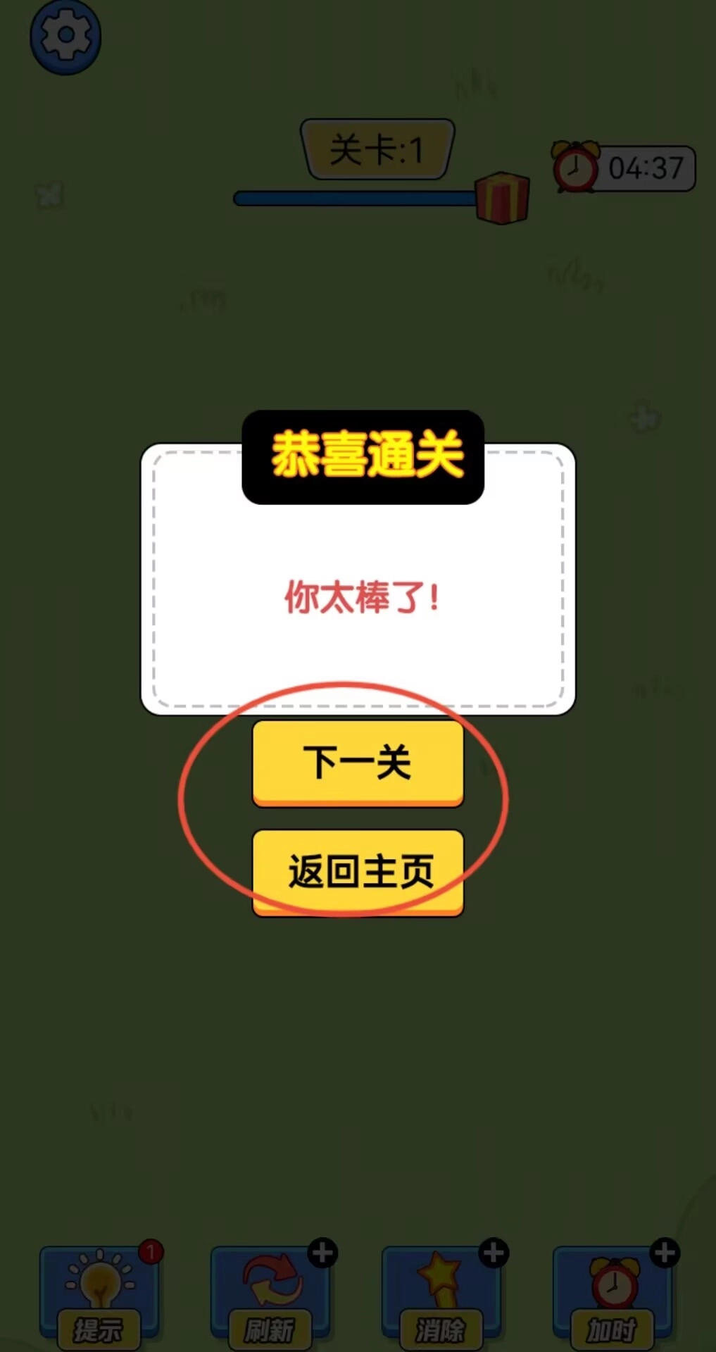 3、持续完成消除任务直至进度条填满即可通关,结算界面会提供进入下一关或返回主界面的选项。