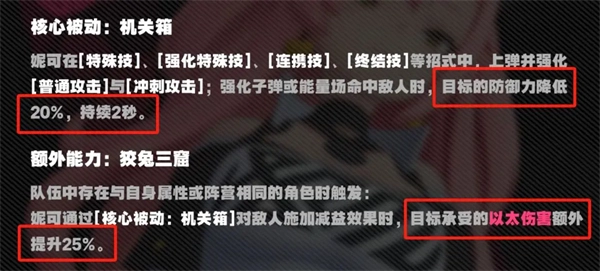 在新版本里,妮可的核心被动调整为减防效果,1级核心技能就具备20%的减防能力,随着等级提升,减防数值会变得相当可观。凭借这一特性,她能灵活加入队伍,充当聚怪兼减防的辅助角色,泛用性得到了大幅增强。要是和以太属性的主C组队,她还能额外提供25%的以太易伤加成。尽管目前暂时没有其他以太属性角色,但整体而言,妮可的功能性已有显著提升。
