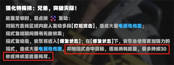 在新版本中,安东的【爆发状态】迎来了显著强化:进入该状态后,能量不再随时间自然流失,状态持续时长也提升至30秒。这意味着他在输出过程中能够更灵活地切换角色或进行闪避操作,对安东而言,这无疑是一次带来质变的改动。