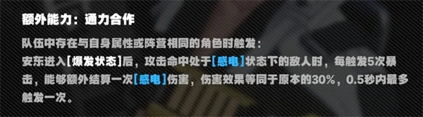 除此之外,安东在【爆发状态】下还新增了感电结算机制,这一机制提升了安东异常精通属性的收益,同时减轻了他的驱动词条压力,因此在游戏前中期,安东已经可以称得上是相当出色的主C了。