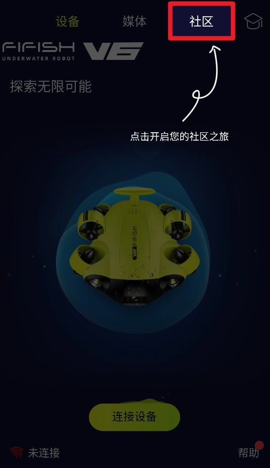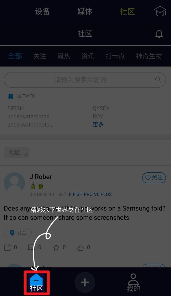 1. 打开应用,点击顶部的“社区”按钮,就能开启探索水下世界的社区之行,同时浏览用户动态。