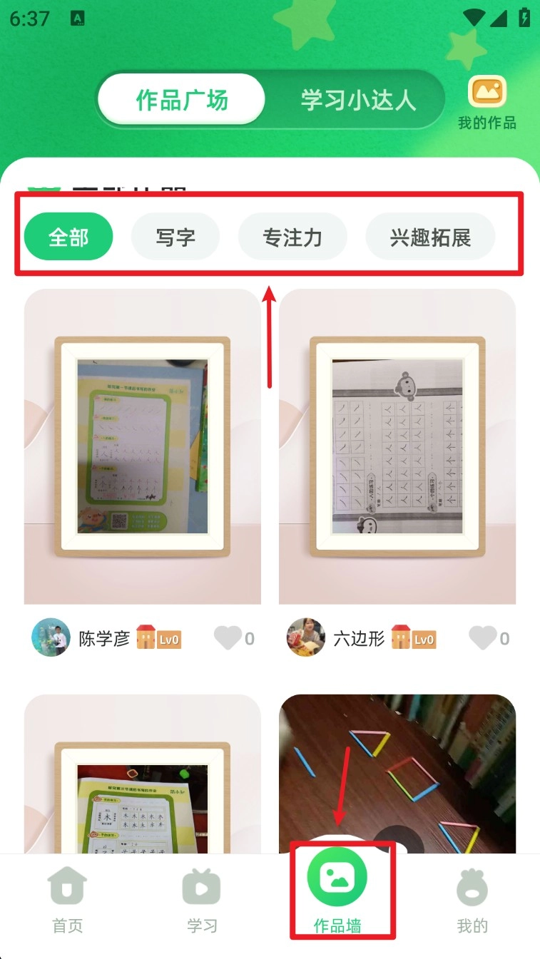 3. 切换到“作品墙”标签页,点击上方分类筛选按钮,查看不同学习主题下的用户作品。