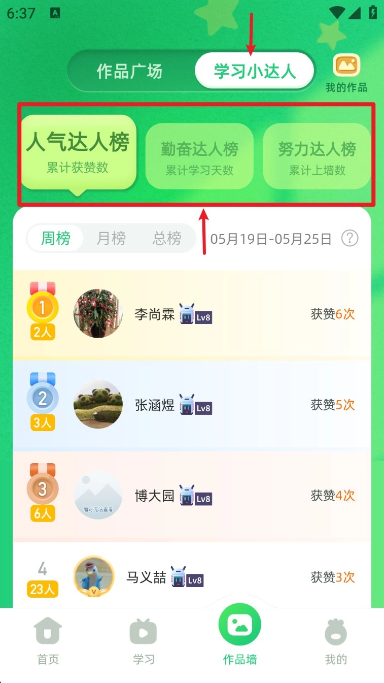 4. 点击右上角“学习小达人”,可查看人气榜、勤奋榜与努力榜,激励孩子持续打卡。